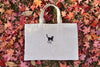 This small tote bag features an embroidered black cat design by embroidery artist uzumu. The bag itself is entirely handmade, each piece crafted with care. Its size perfectly fits the “Marui Vegan” box, making it ideal for purchase as a gift set or for carrying small items.